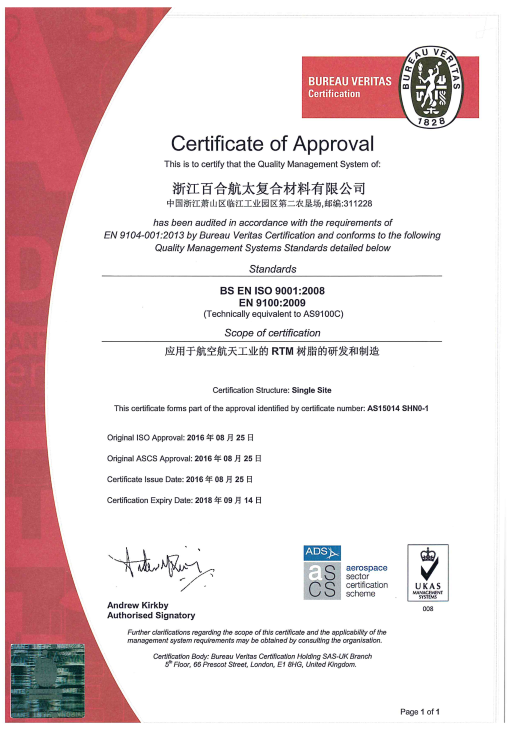 浙江百合航太復合材料有限公司成立于2014年,是集先進復合材料產品開發設計、生產、銷售、服務于一體的高新技術企業, 主要產品有復合材料液體成型樹脂、碳纖維、玻璃纖維和芳綸纖維預浸料、以及結構粘合劑膠膜等。